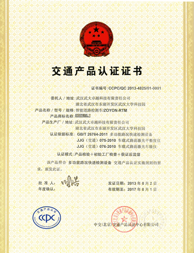 2013年8月2日,武漢武大卓越科技有限責任公司獲得由中交(北京)產(chǎn)品認證中心有限公司頒發(fā)的交通產(chǎn)品認證證書。此次認證是對卓越科技產(chǎn)品在道路養(yǎng)護行業(yè)的實力又一次肯定。