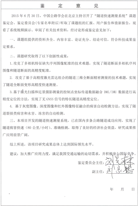 鑒定過程中,鑒定委員會聽取了卓越科技的匯報、用戶報告和查新報告,觀看了視頻演示,審閱了有關(guān)技術(shù)資料,經(jīng)討論形成鑒定意見。本項目開發(fā)的隧道快速測量系統(tǒng),已在國內(nèi)多條公路隧道成功應(yīng)用,實現(xiàn)了隧道病害(80公里/小時)、準確檢測,取得了良好的經(jīng)濟社會效益,研究成果推廣應(yīng)用前景廣闊??傊涸擁椖垦芯砍晒傮w上達到國際領(lǐng)先水平。