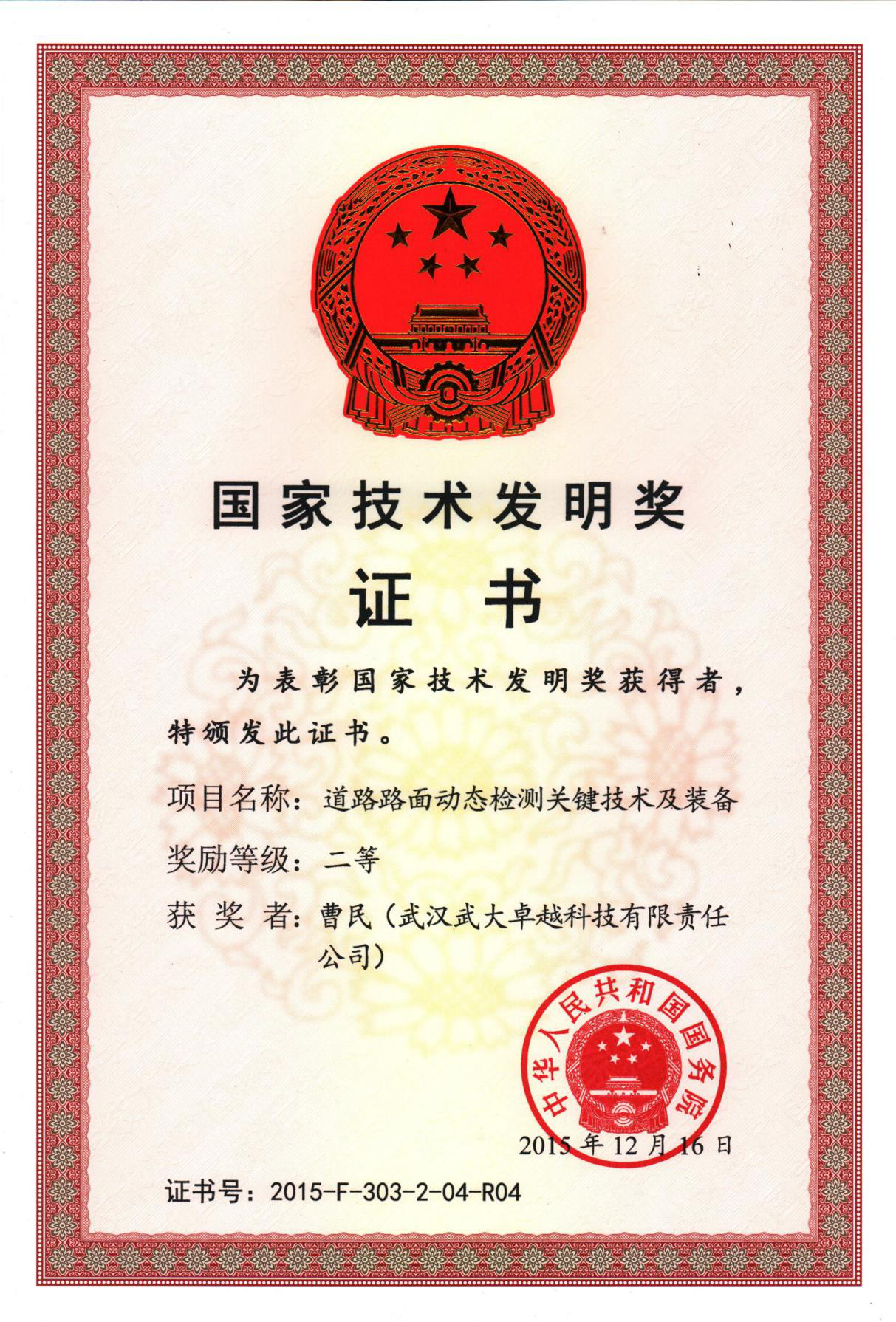 圖為卓越科技董事長兼總裁曹民先生獲得的國家技術(shù)發(fā)明獎證書