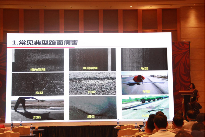 圖為武大卓越總工程師林紅進行“基于3D激光測量技術(shù)的路面病害檢測方法”演講