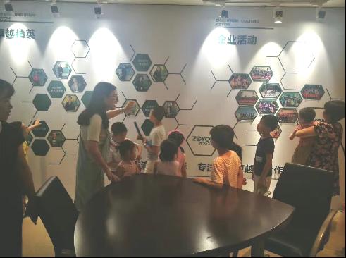 小朋友們在行政管理部童經(jīng)理的帶領下參觀爸爸媽媽的工作場所。
