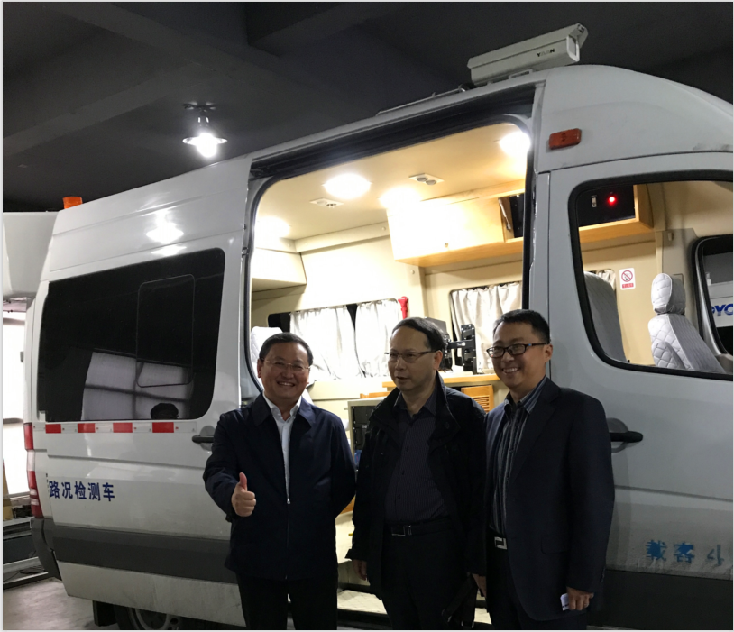 隨后,余國珊會(huì)長一行來到武大卓越科技裝備生產(chǎn)車間,饒有興致地參觀了智能道路檢測系統(tǒng)、激光動(dòng)態(tài)彎沉測量系統(tǒng)裝備,并詢問系統(tǒng)功能及工作原理。下圖為余國珊會(huì)長(圖左二)一行與曹民董事長(圖左三)在智能道路檢測系統(tǒng)前的合影留念。?