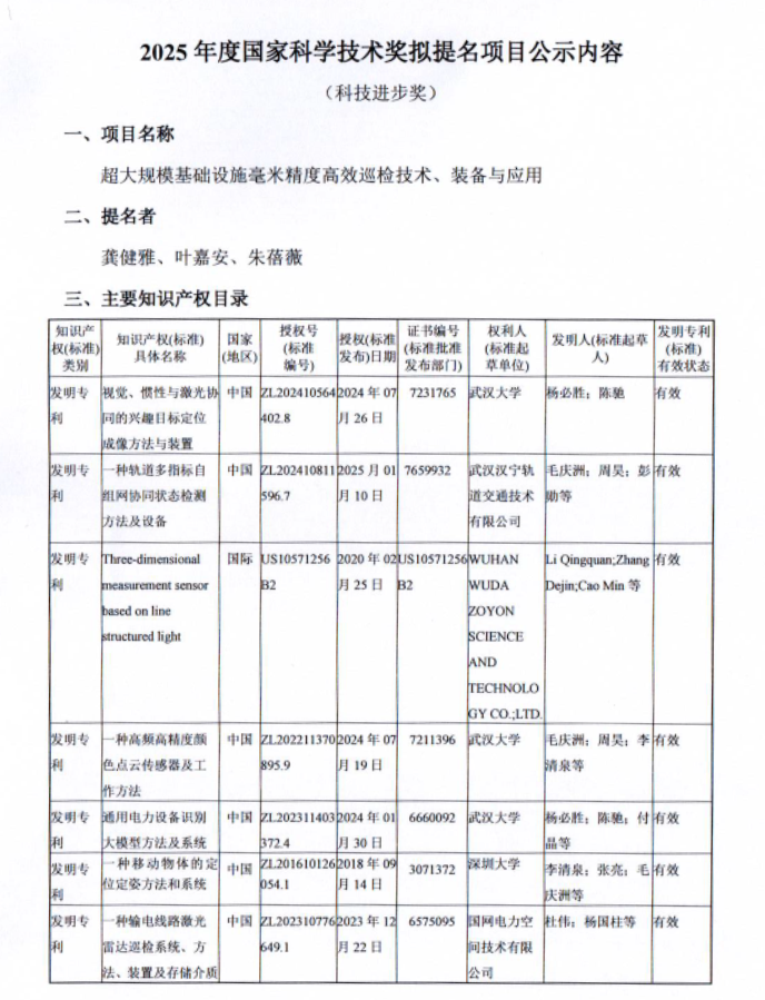 根據(jù)《國(guó)家科學(xué)技術(shù)獎(jiǎng)勵(lì)工作辦公室關(guān)于2025年度國(guó)家科學(xué)技術(shù)獎(jiǎng)提名工作的通知》(國(guó)科獎(jiǎng)字〔2025〕4號(hào))的相關(guān)要求,現(xiàn)將我單位擬提名項(xiàng)目“超大規(guī)?;A(chǔ)設(shè)施毫米精度高效巡檢技術(shù)、裝備與應(yīng)用”的項(xiàng)目名稱、提名者、主要知識(shí)產(chǎn)權(quán)和標(biāo)準(zhǔn)規(guī)范等目錄、主要完成人、主要完成單位等信息進(jìn)行公示,公示內(nèi)容如下。